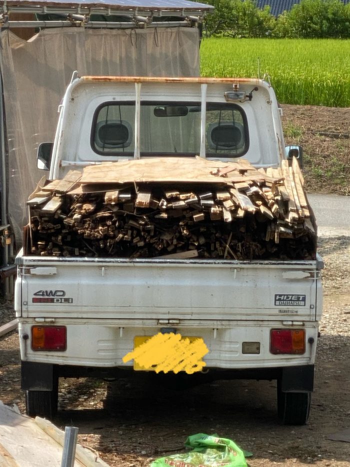 が、今回からお仕事をお願いした代表のおじいちゃんは、さすが!几帳面な方なので荷台にバラバラだった残木らを隙間なく積み重ね、3往復分も1度に運ぶことができ、時短と節約の一石二鳥!処分するとはいえ今まで手抜きしていたことがバレバレでした。