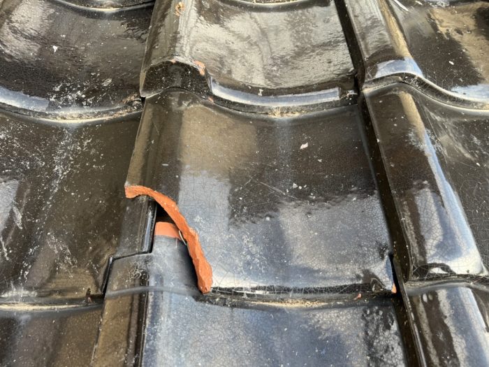 地面に瓦の破片が落ちているのを見つけたS様からご依頼いただきました。お屋根に上がらせていただくと比較的新しくきれいな瓦屋根で破損個所もすぐ見つけることができました。屋根の異変に早く気付くことができてよかったです。気づかないまま放置しているとこんな小さな欠け部分からでも雨や雪が浸透していわゆる「雨漏り」に進行してしまうので、そうなってしまってからは修理箇所も広範囲になって修繕費もその分かかってしまいます。